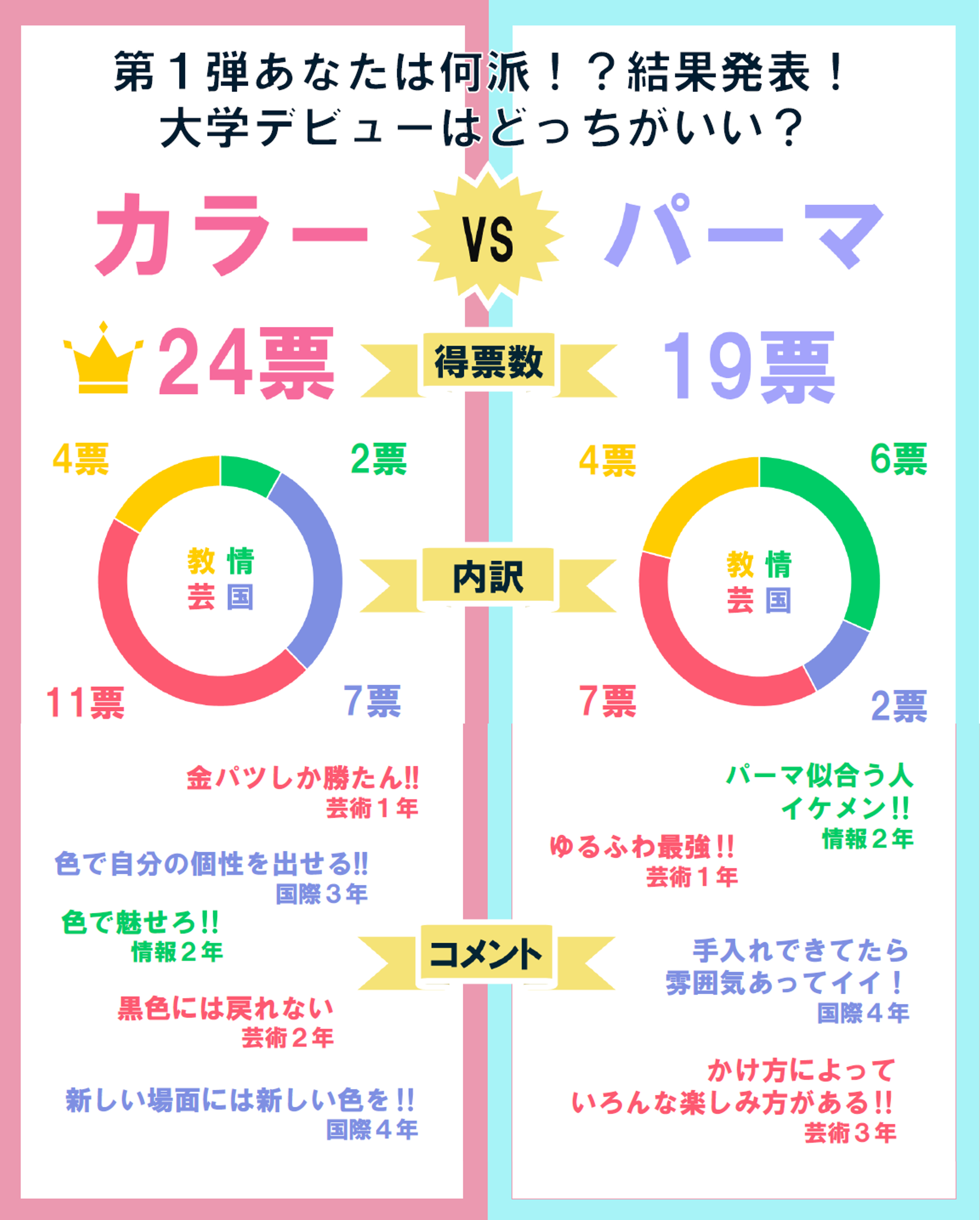 カラー 24票 vs パーマ 19票となり、接戦の末「カラー派」に軍配が上がりました!