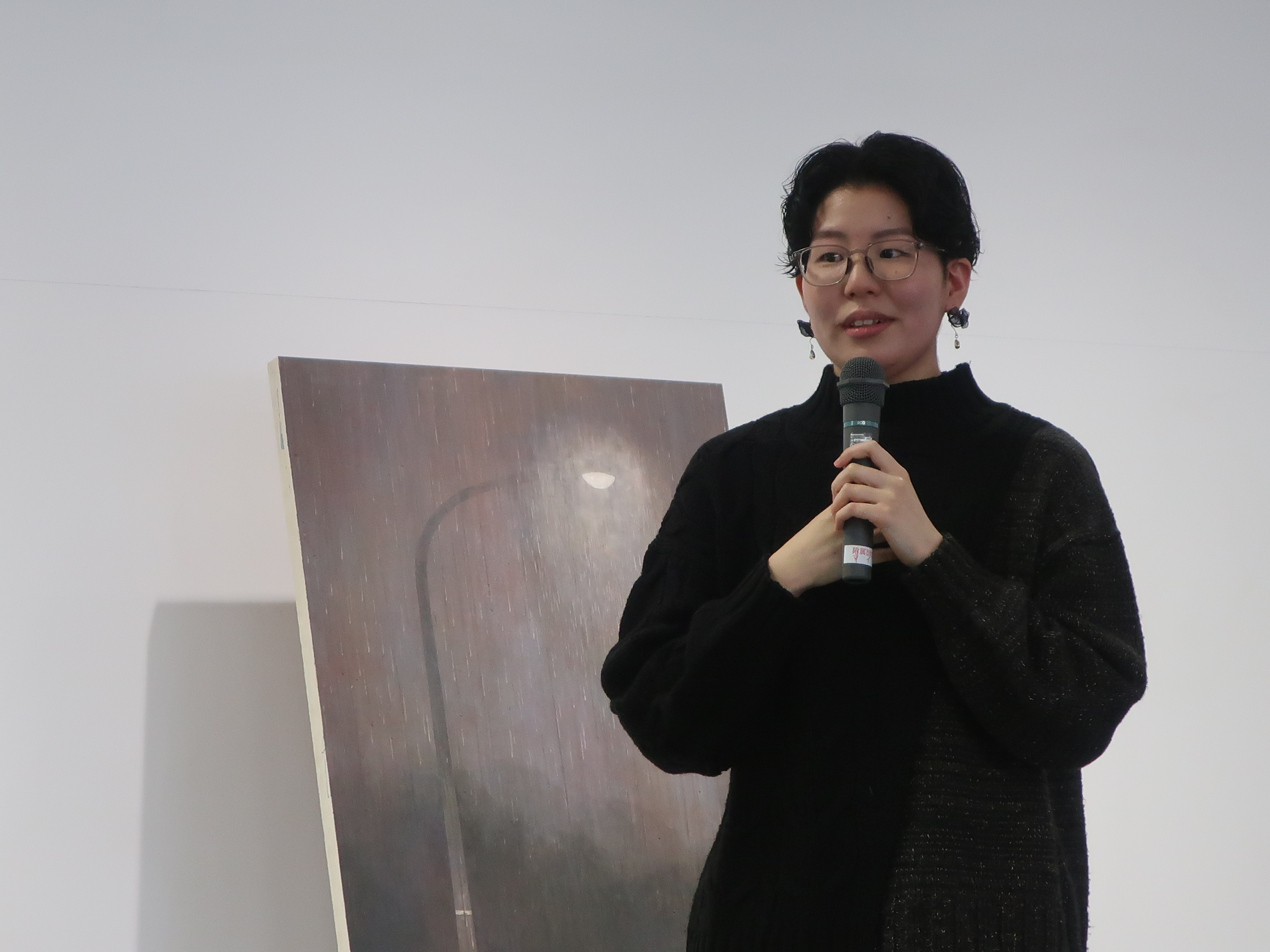 中でも、「雨」(2022)は、高校時代に聴いた村下孝蔵『初恋』(1983)の「五月雨は緑色」という歌いだしが作品づくりのきっかけとなったというエピソードには、大人のオーディエンスから思わず声が漏れるほど。(学生のみなさんもきっと一度は聞いたことがあるはずですが…。)作品の隣には、「雨は何色なんだろう。」という問いの答えを探すために読んだという「雨を、読む。」(佐々木まなび)が展示してあり、髙見さんの「ことば」への興味や好奇心を感じることができました。