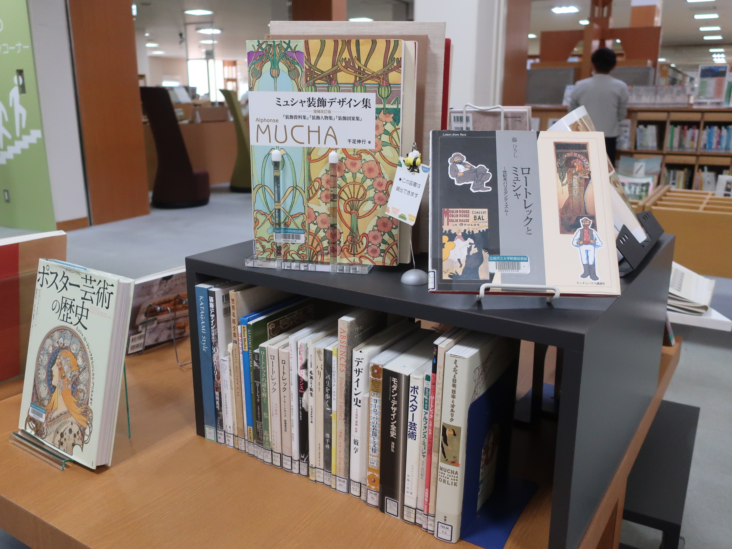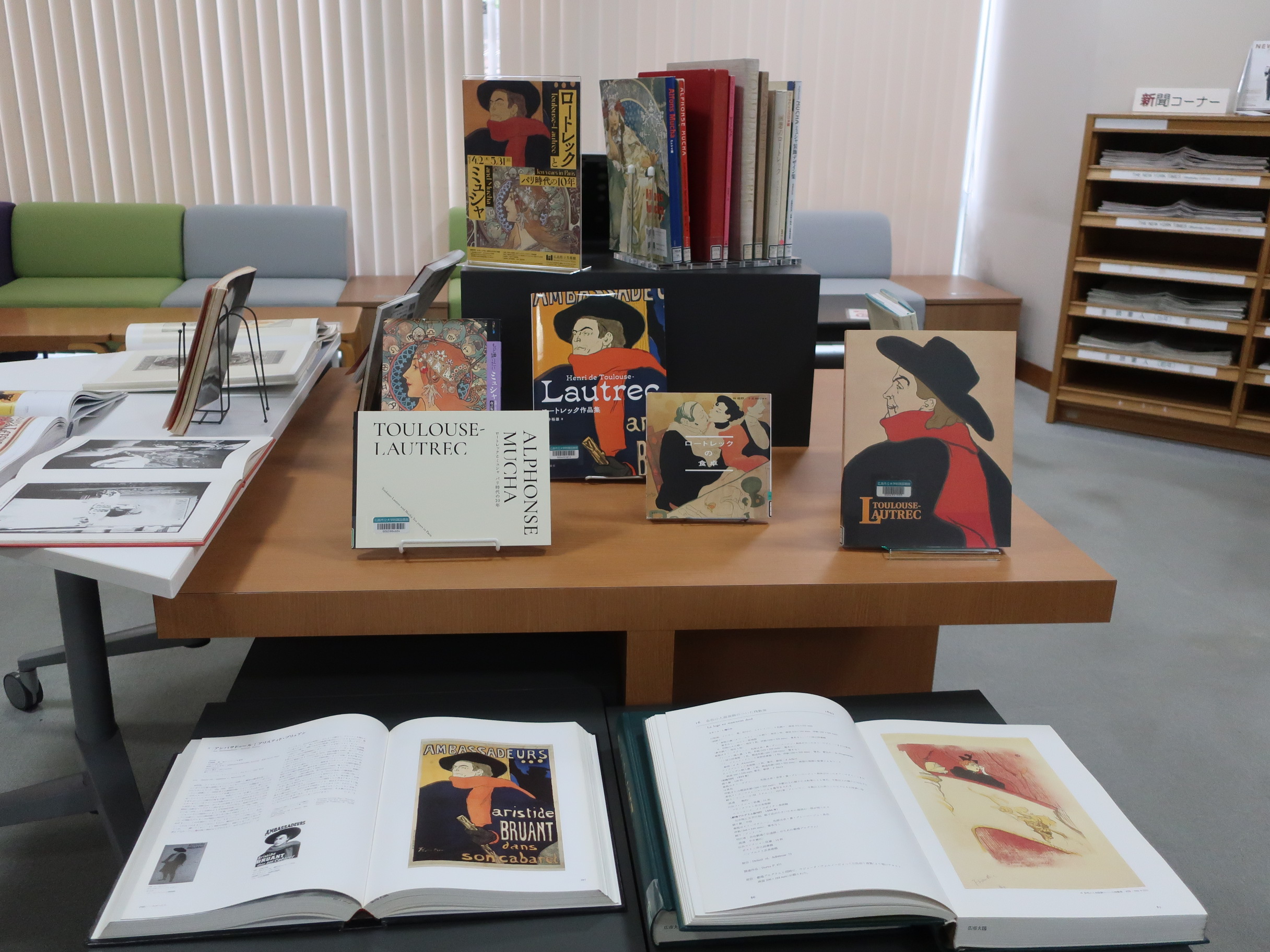 新着図書コーナー奥「広島市現代美術館特別展 ロートレックとミュシャ パリ時代の10年」関連展示